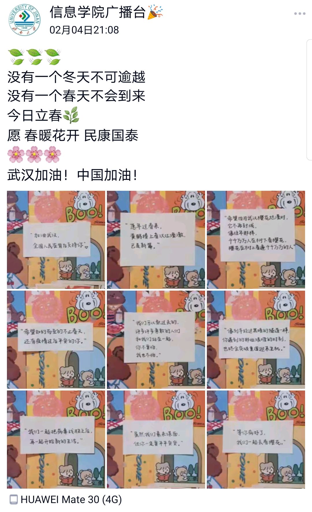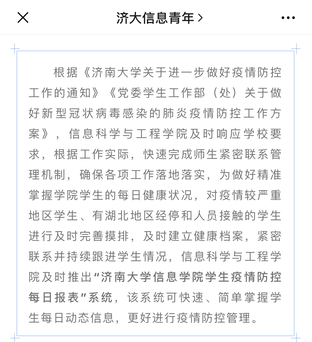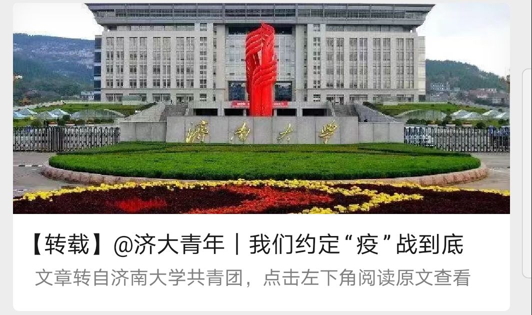 全体学生的倡议书》、《@济大青年|我们约定“疫”战到底》通过微信推送的形式发送至每位同学并及时发布《新型肺炎的公共场所卫生防护指南》、原创微信文章《共度难关,我们在一起》,将抗疫正能量传递给信院每位青年。