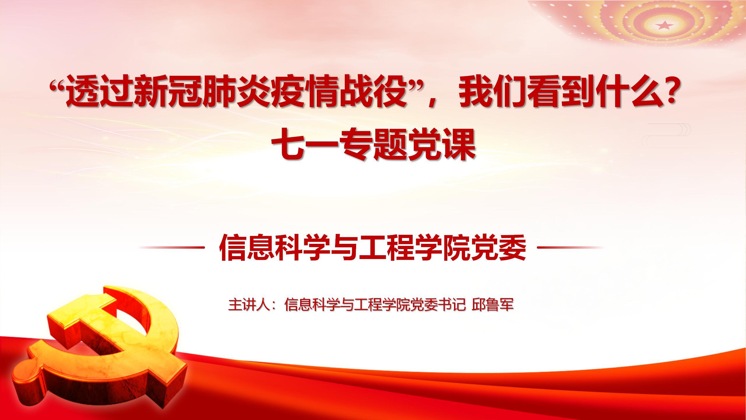 为庆祝中国共产党成立99周年,深入学习贯彻习近平新时代中国特色社会主义思想,切实增强全院师生党员政治意识、大局意识、核心意识、看齐意识,6月30日下午,PG娱乐官网 党委书记邱鲁军以《透过新冠肺炎疫情战役,我们看到了什么》为主题,为全院师生党员讲授了一场生动的专题党课。党课由院长陈贞翔主持。