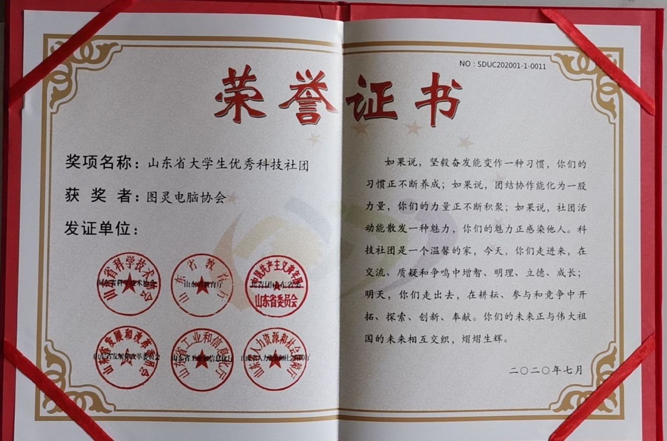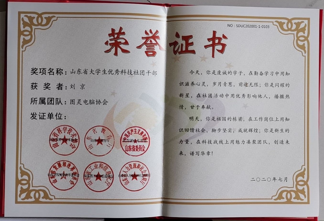 图灵电脑协会荣获“2020年山东省大学生优秀科技社团”称号,刘京同学获“2020年山东省大学生优秀科技社团干部”。