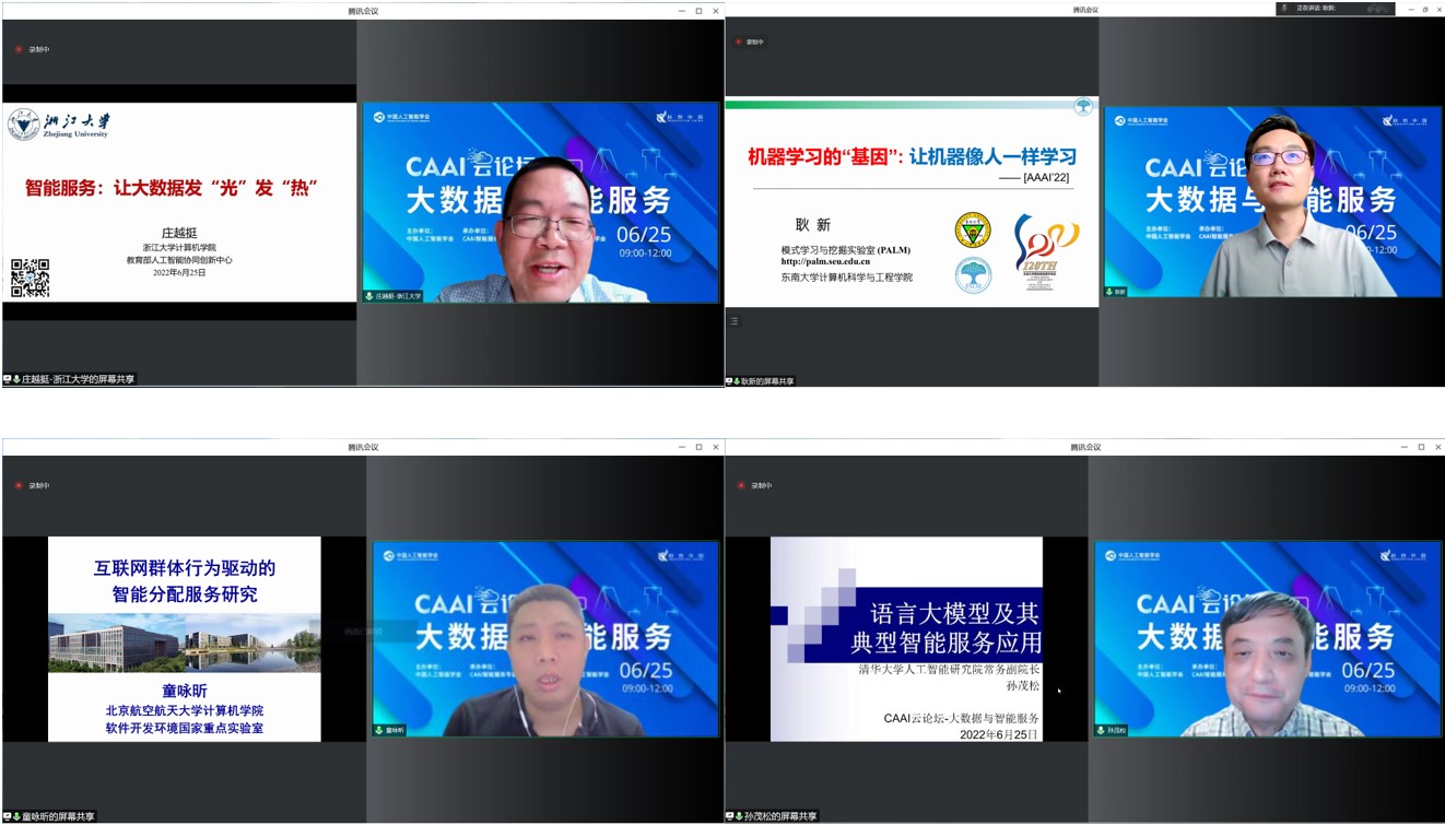 外籍院士、清华大学人工智能研究院常务副院长孙茂松教授,国家杰青、教育部长江学者特聘教授、浙江大学庄越挺教授,国家杰青、东南大学研究生院常务副院长耿新教授,国家优青、北京航空航天大学童咏昕教授,做特邀报告。论坛期间还举行了“大数据与智能服务前沿”主题Panel。