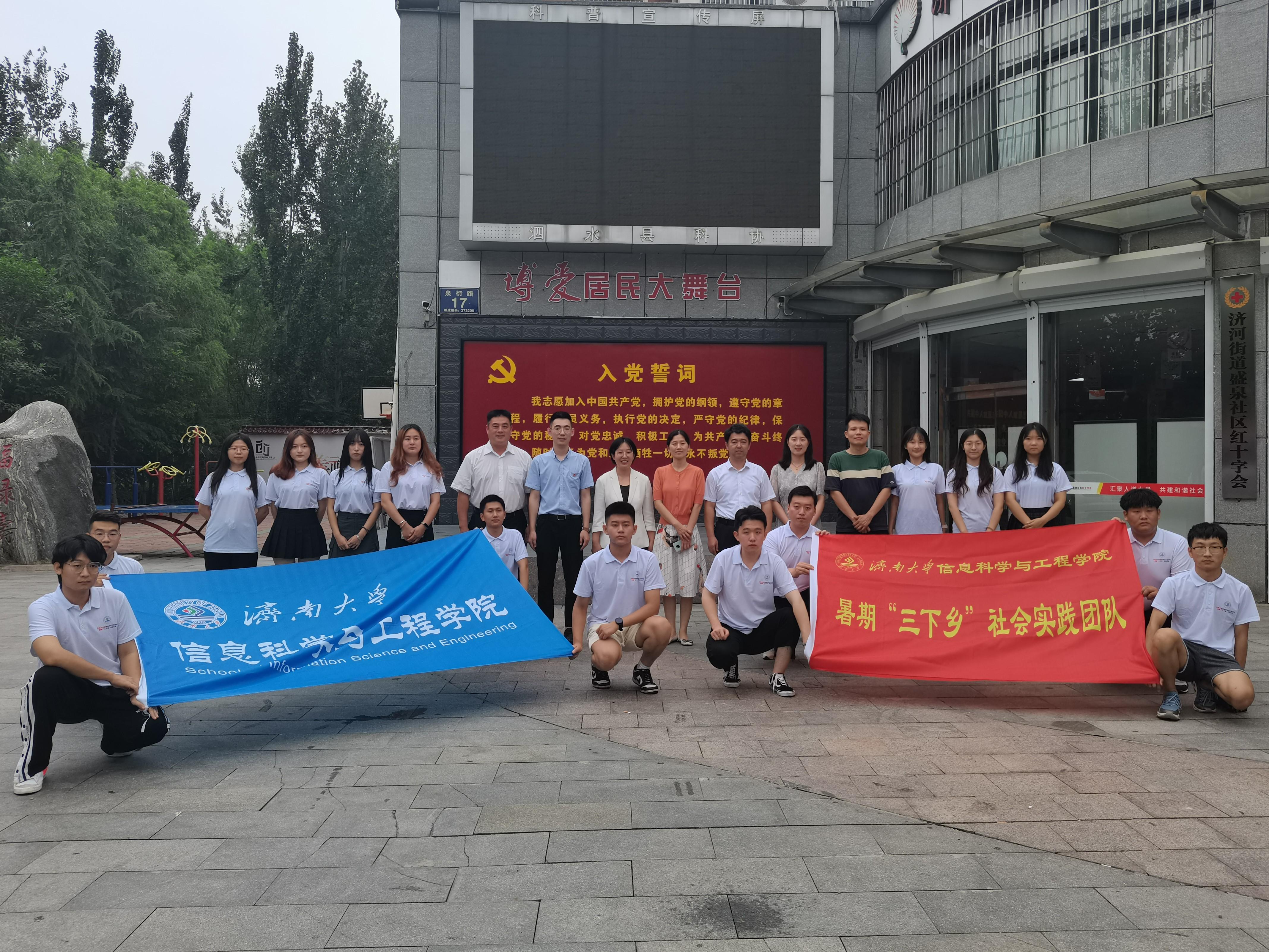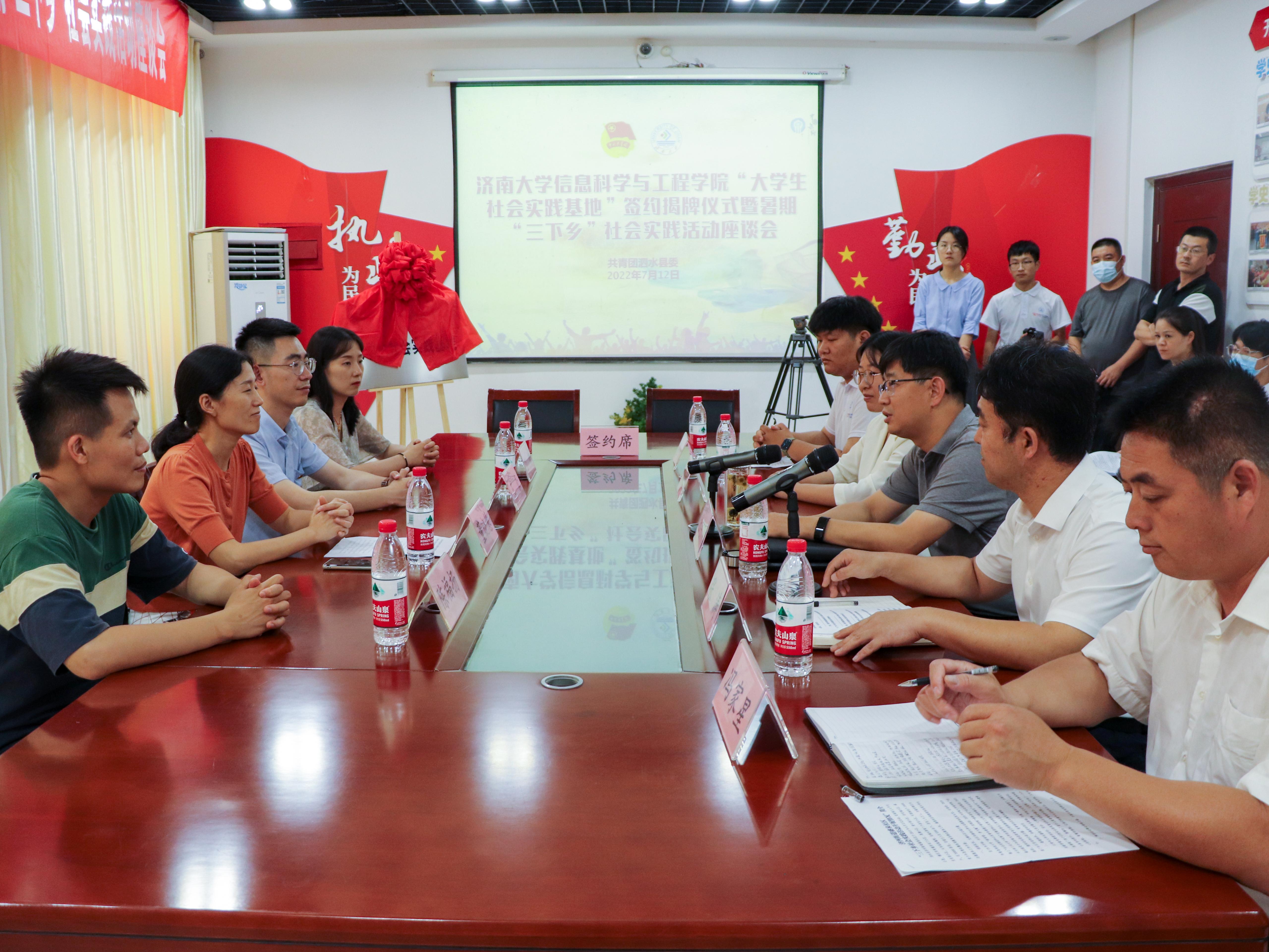 与共青团泗水县委、泗水县济河街道盛泉社区举行“大学生社会实践基地”签约揭牌仪式暨暑期“三下乡”社会实践活动座谈会,泗水县委副书记张宇飞,共青团泗水县委书记王晓,济河街道盛泉社区党委书记冯家星,PG娱乐官网