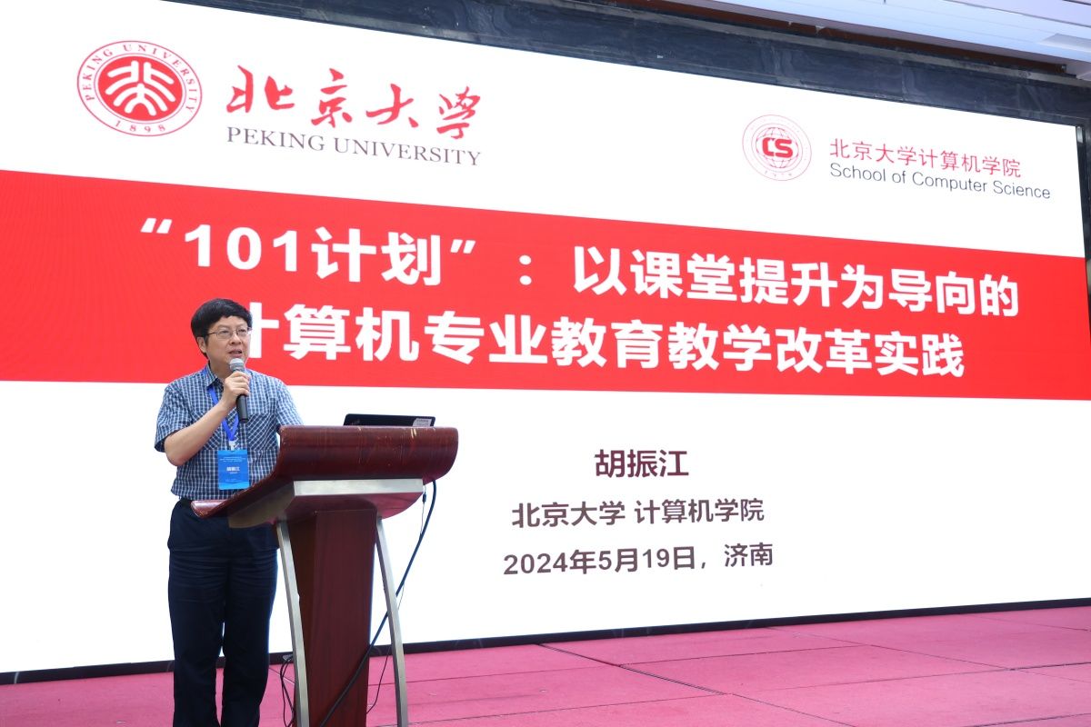 院长胡振江教授作了题为“‘101计划’:以课堂提升为导向的计算机专业教学改革实践”的特邀报告。报告中,胡振江介绍了“101计划”的总体思路和目标,阐述了项目实施的教研机制,他强调了计算机专业教学改革的重要性,提出了以科学顶层设计推进有组织人才培养改革、以小切口要素改革牵引培养模式深层变革、以数字教育赋能多元化教研机制等思路,并对“101计划”未来建设进行了规划和展望。