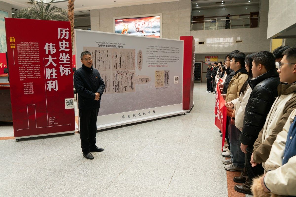 党委书记夏卫东为全体师生党员讲授专题党课。他强调,铭记党史、缅怀先烈是党员的必修课,大家要深刻领悟红色历史中蕴含的精神力量,在思想上持续淬炼提升,在行动上主动担当作为,以实干实绩响应时代号召。随后,在讲解员的带领下,依次参观了“伟大胜利 历史坐标”“运筹帷幄 剑指济南”“八天八夜 鏖战古城”“攻坚之战 决胜密码”等八大主题展区,展板上的史料图片,生动再现了济南战役的战略部署、隐蔽战线、人民支前等情景,全体师生党员驻足在烈士名录与资料图片前,深切缅怀革命先辈的英雄事迹。
