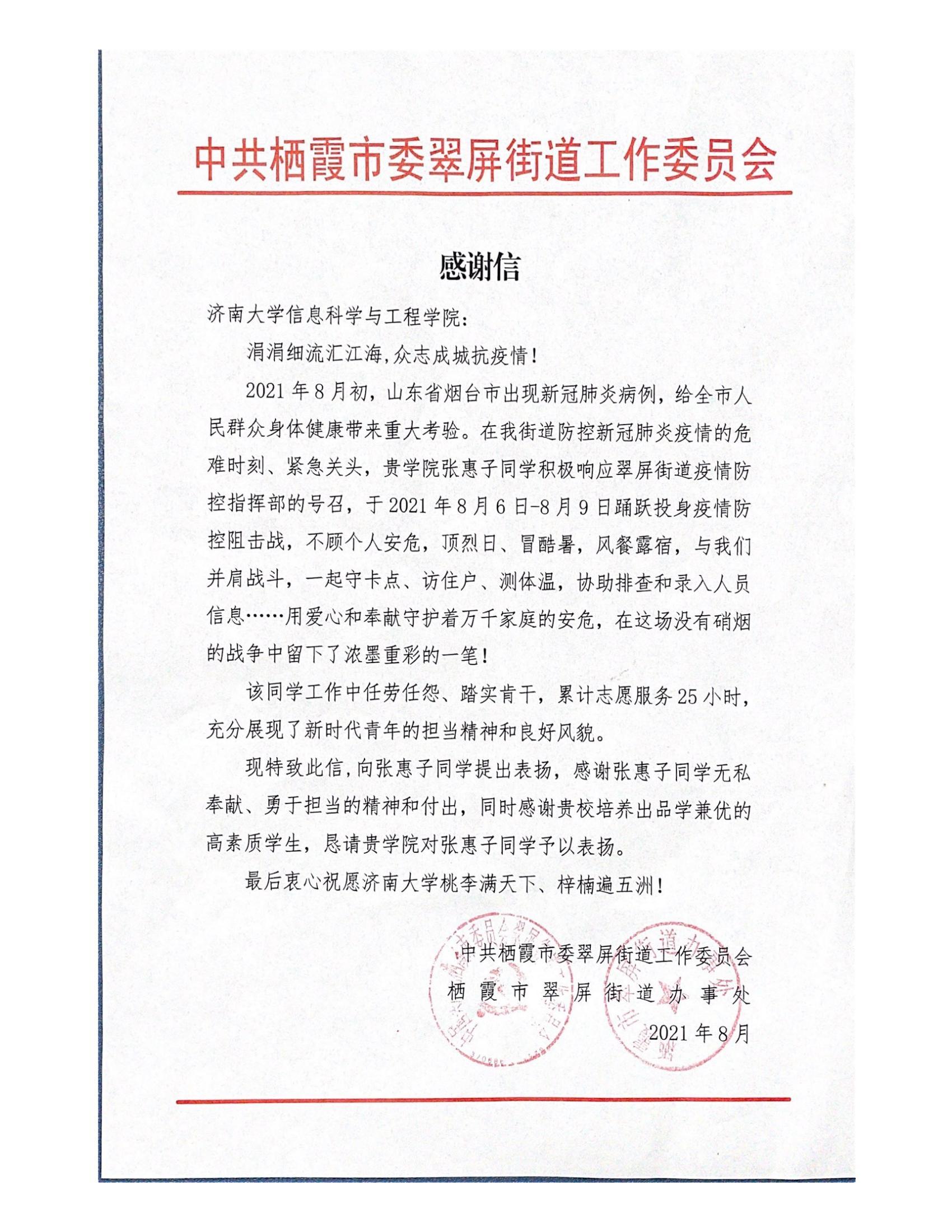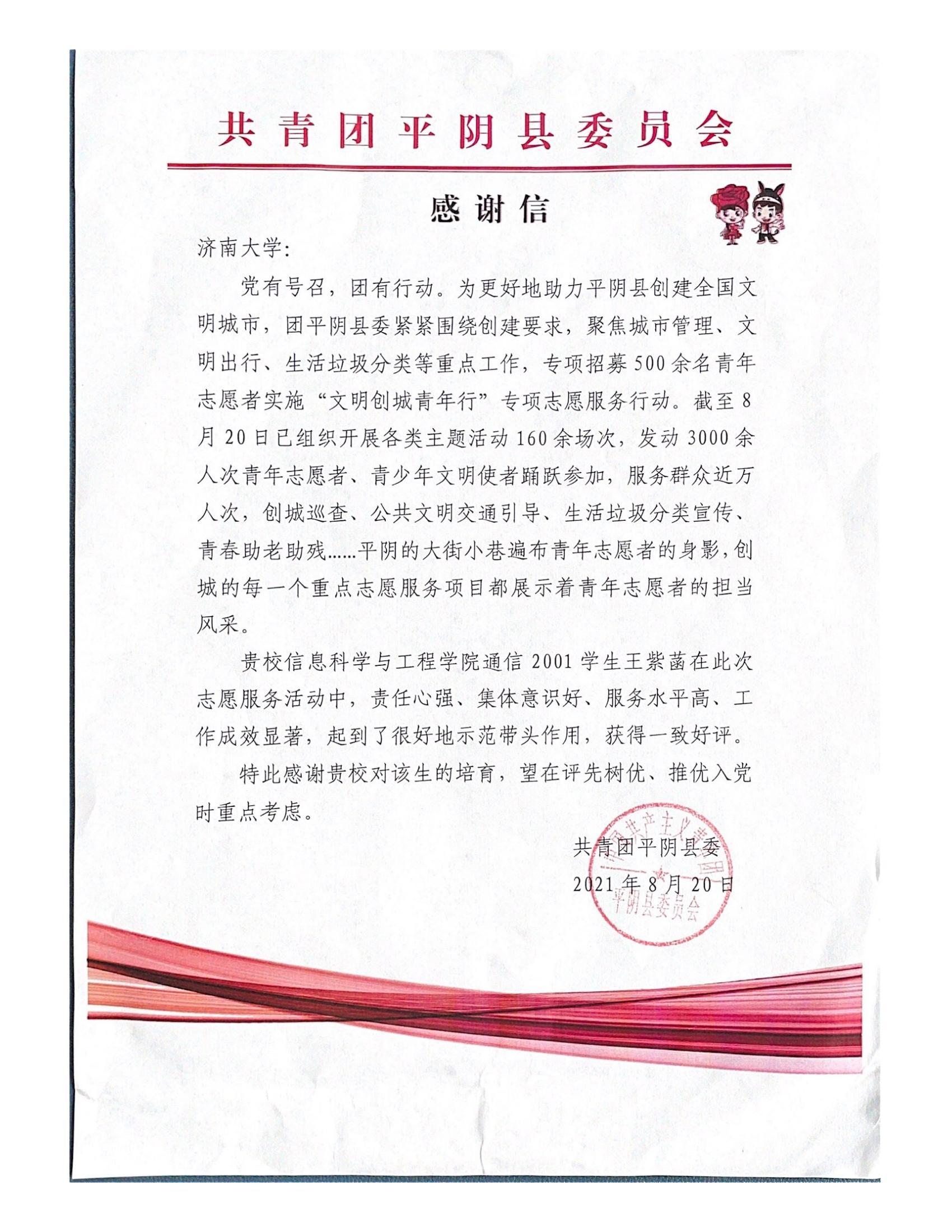 近日,PG娱乐官网 收到来自共青团平阴县委员会和中共栖霞市翠屏街道工作委员会的感谢信,感谢PG娱乐官网 学生王紫菡和张惠子在志愿服务活动中的积极表现以及担当精神。