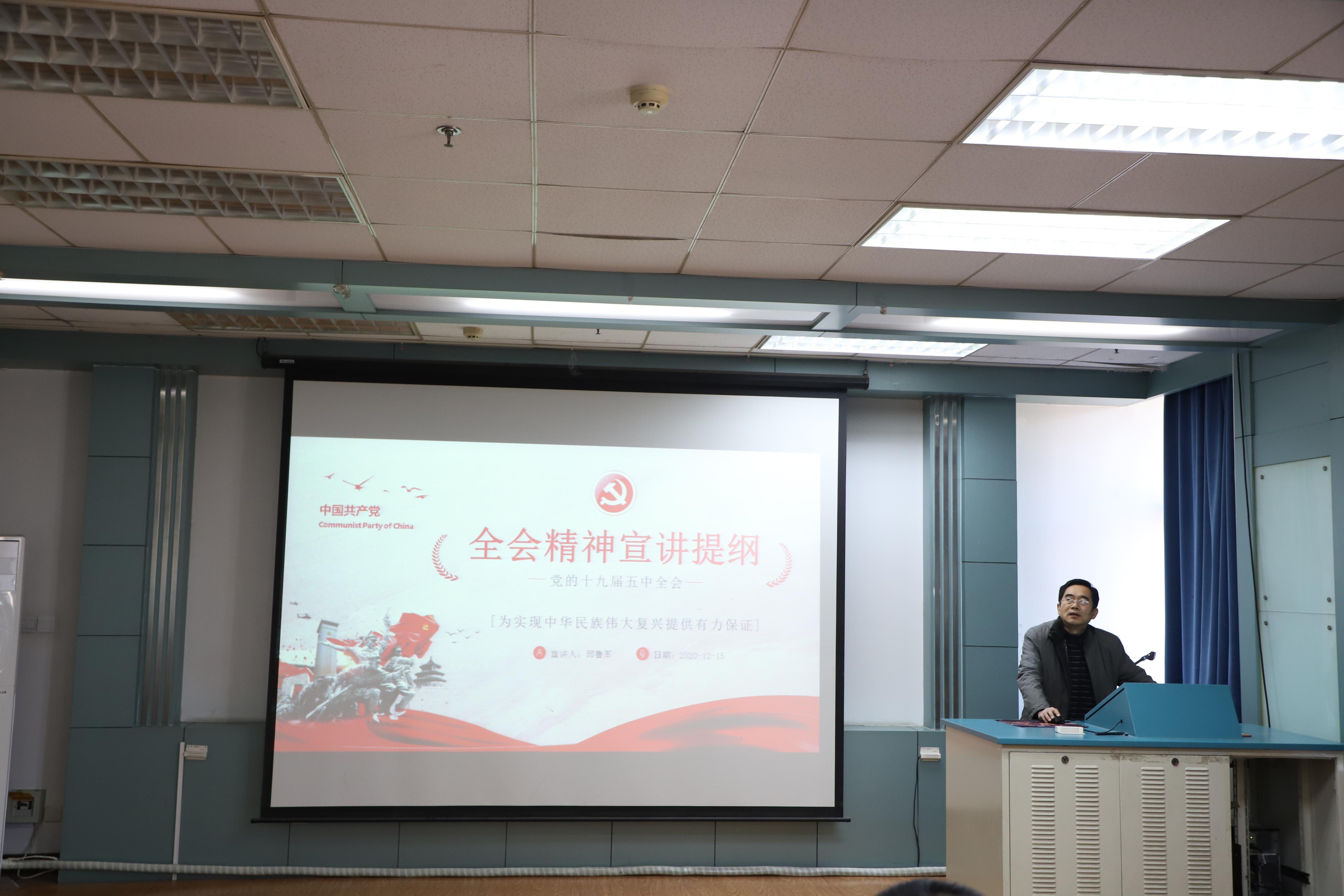 12月15日下午,PG娱乐官网 在12教703教室举行学习贯彻党的十九届五中全会宣讲会,PG娱乐官网 党委书记邱鲁军作专题报告,PG娱乐官网 各党支部书记、支部委员以及学生代表参加宣讲会。