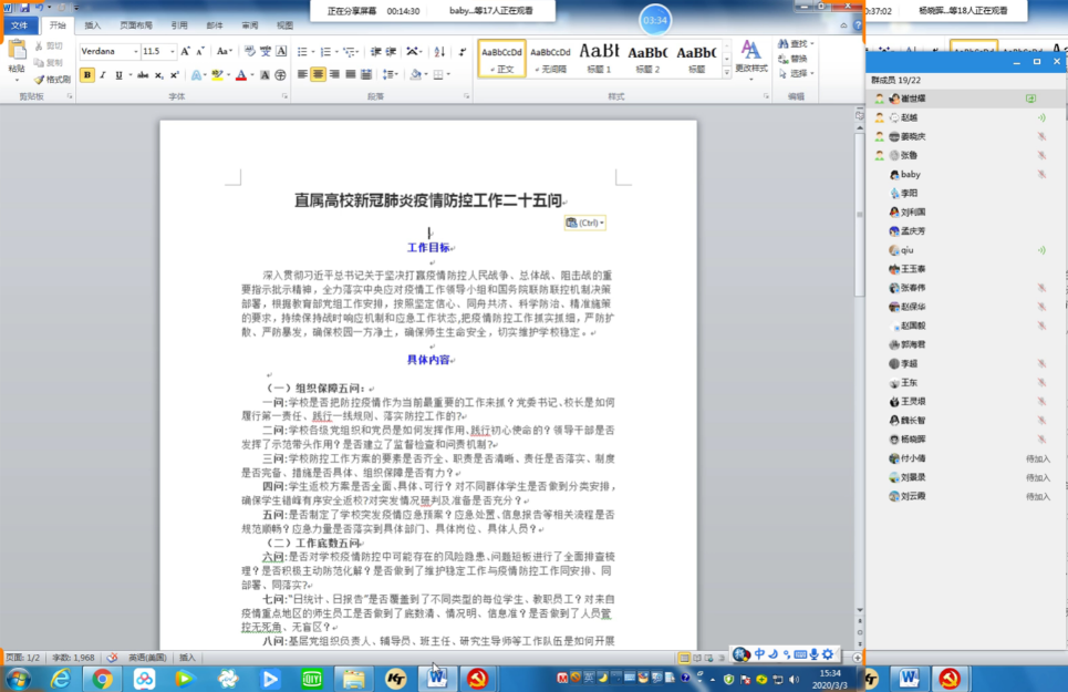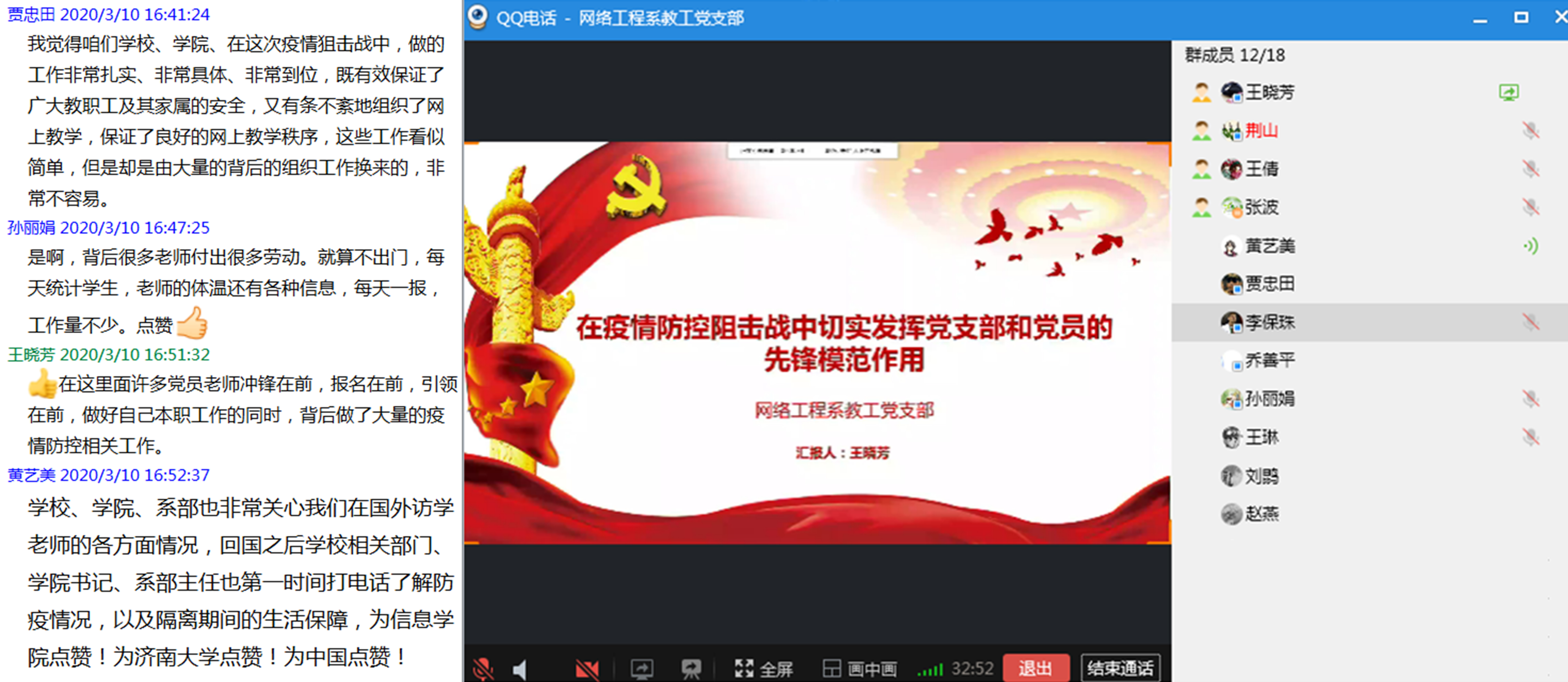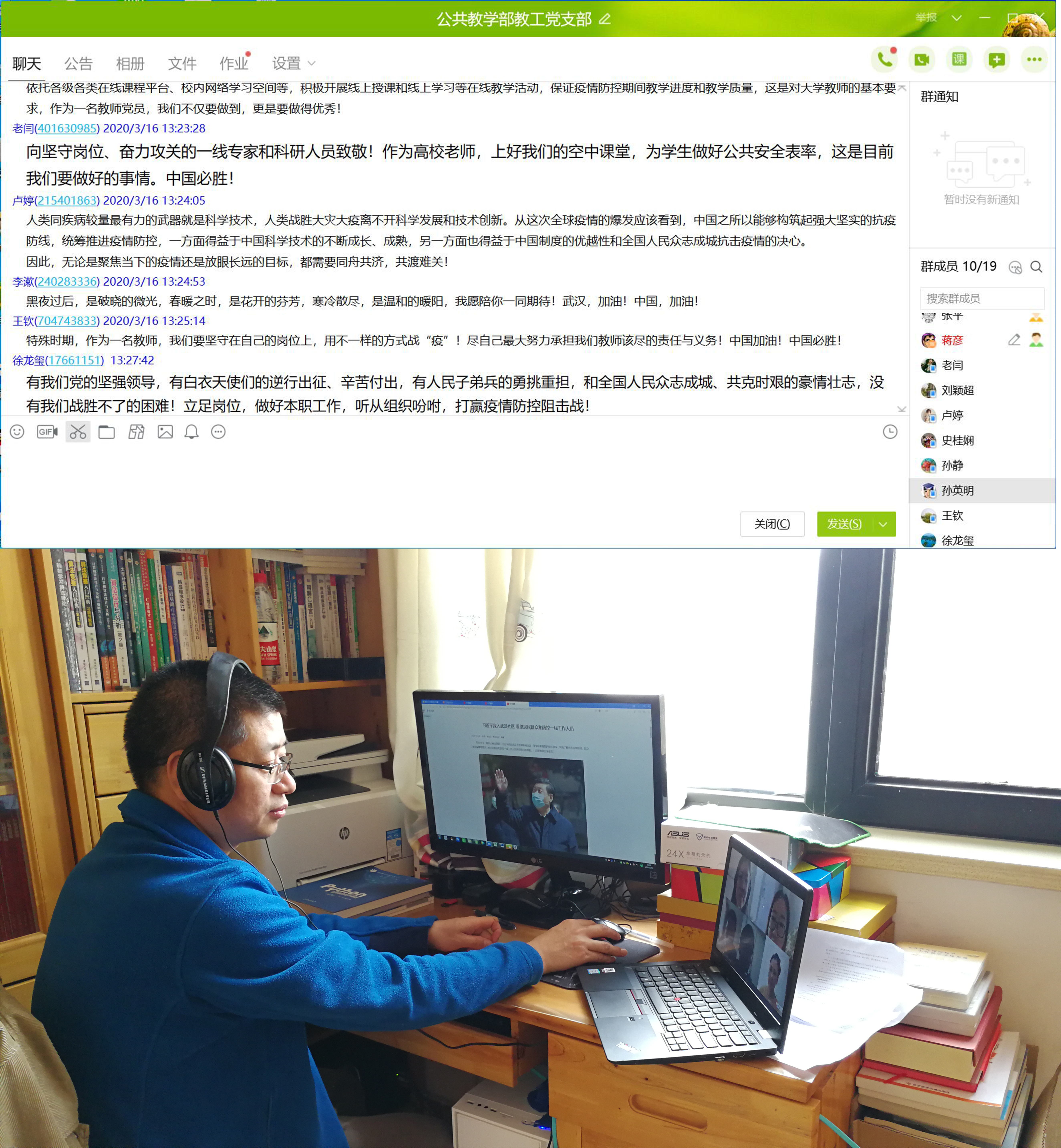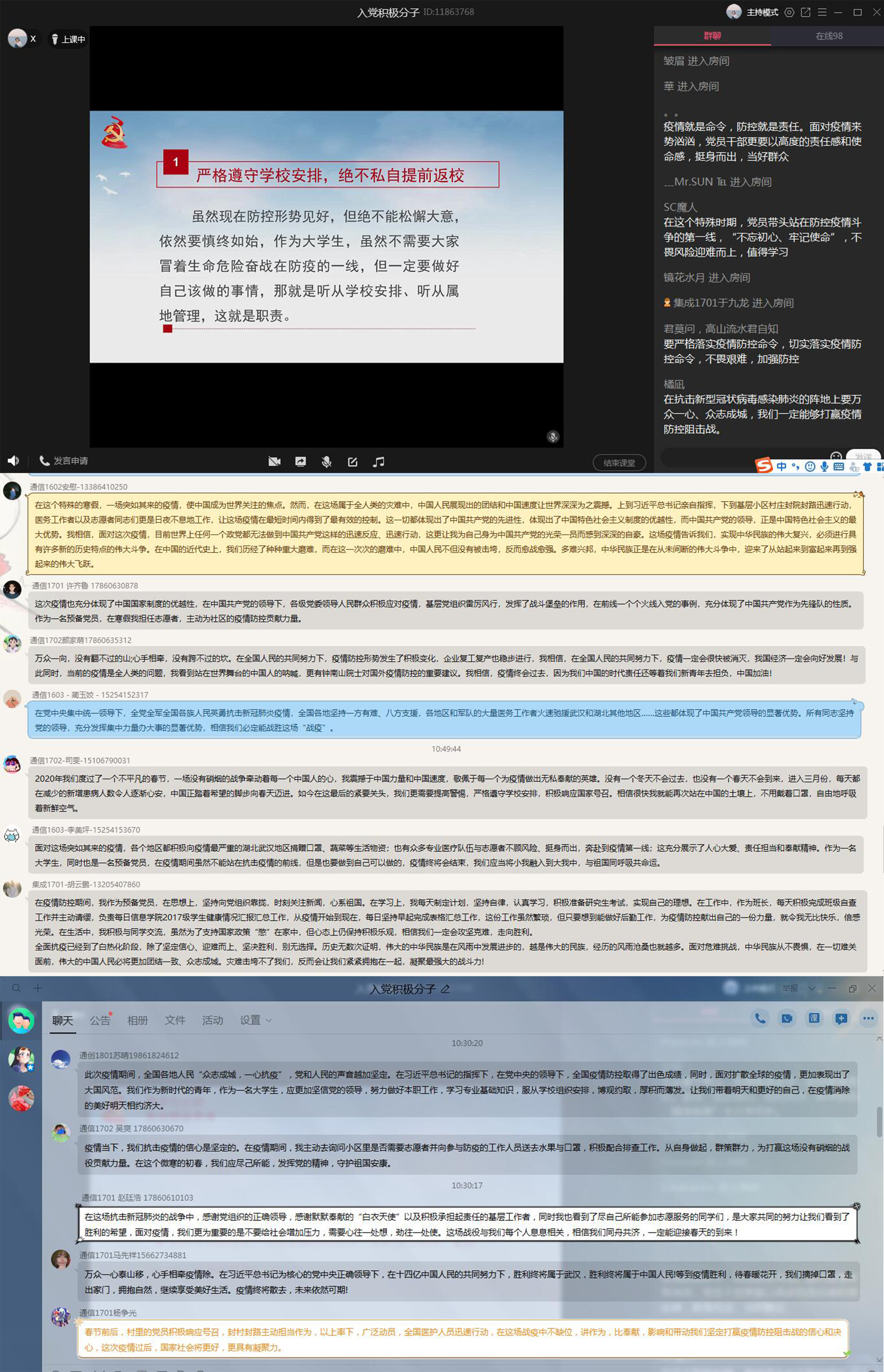 全体党员师生和入党积极分子在家里,认真收听收看并做笔记,同时积极参加线上互动讨论活动。整堂党课,内容丰富、针对性强,有很强的感染性和教育性。