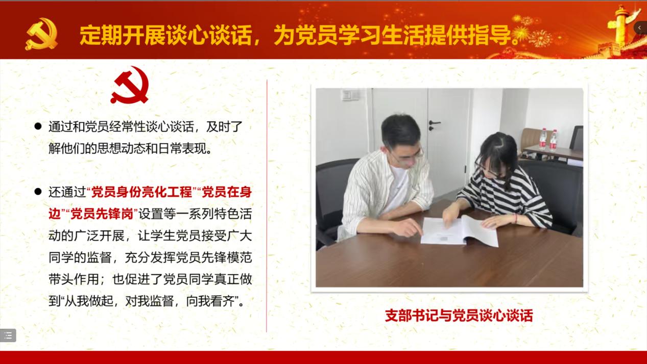 基层组织工作条例》《中国共产党支部工作条例(试行)》,创新党支部活动方式,持续培育“一支部一品牌”党建特色品牌,深入推进党建联建共建,增强党支部活力,培育高质量党建创新成果。三是要以党员队伍建设为抓手,发挥党员先锋模范作用。对党员开展多形式、分层次的教育培训,加强党员教育管理监督,进一步完善督查和考核评价机制,加强分类指导,细化责任清单,发挥党员在课程思政、学风建设、学科竞赛等方面的作用。