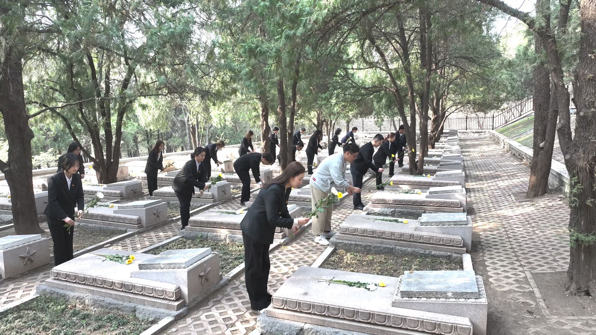 革命烈士纪念塔前静谧肃穆,烈士墓碑整齐排列。在烈士墓前,大家整齐列队,依次献上手中的鲜花,表达对烈士们的深切缅怀和崇高敬意。一朵朵鲜花寄托着无尽的哀思和敬仰,也传递着新时代青年继承先烈遗志、砥砺前行的坚定信念。