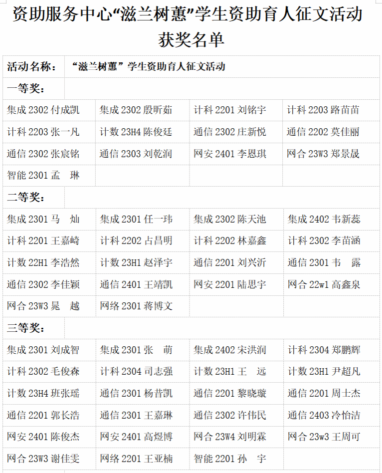 的资助让他们重拾希望,得以在知识的海洋继续遨游;有的学生则分享了在获得资助后,如何从自卑怯懦变得自信勇敢,积极参与社会实践与志愿服务,努力实现自我价值的转变过程。这些征文情真意切,字里行间洋溢着对资助政策的感恩之情,以及在困境中坚守梦想、砥砺前行的决心。下面是本次征文活动的获奖名单: