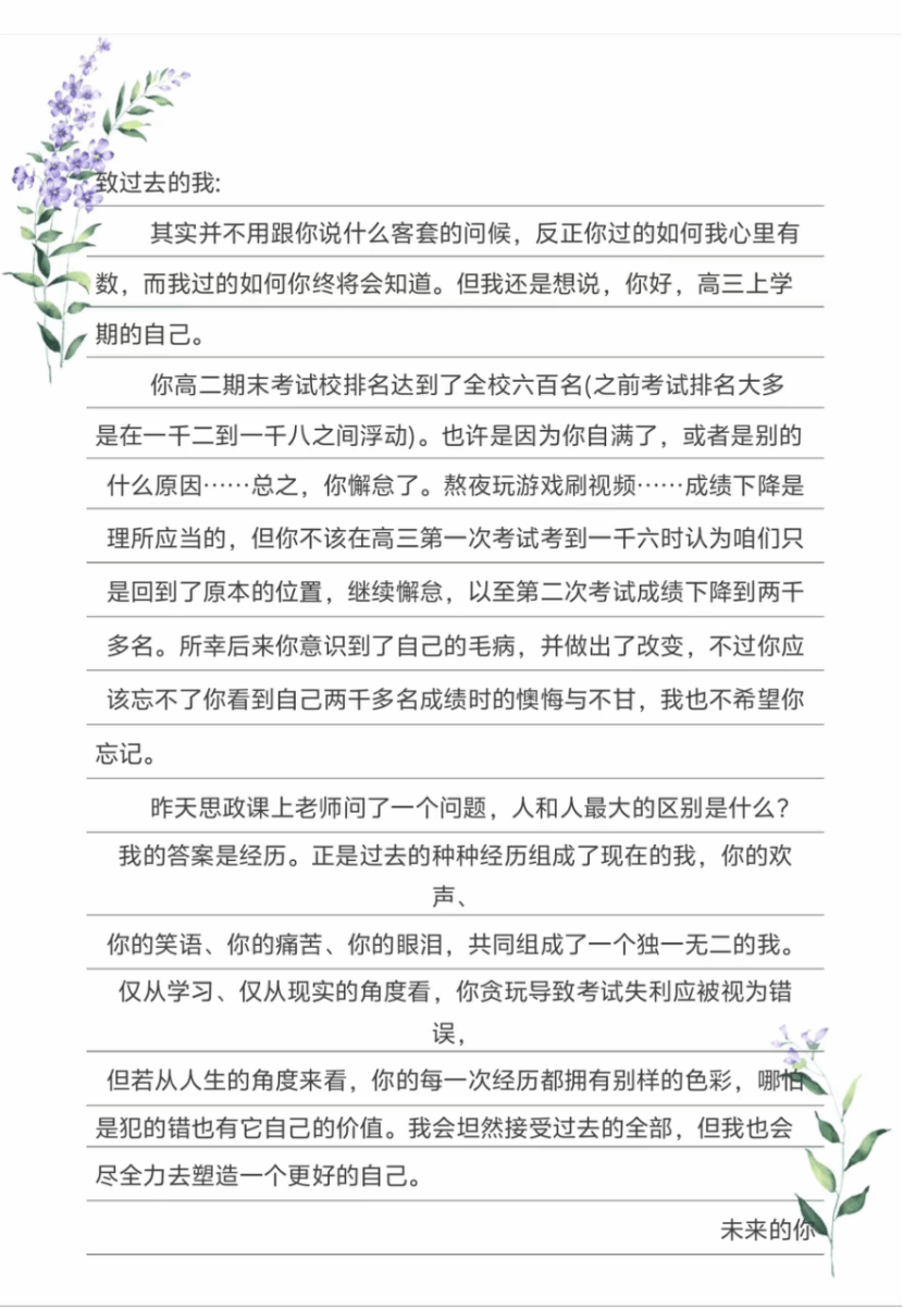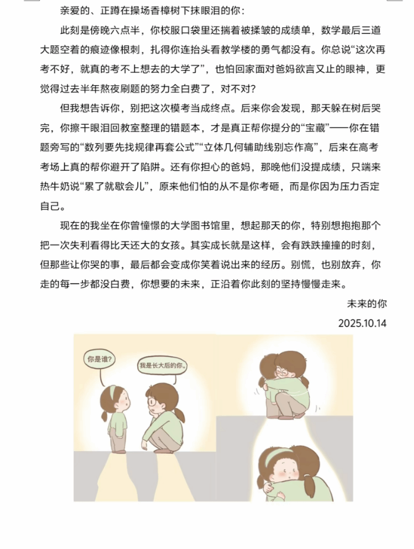 据了解,活动以“跨时空成长对话”为核心,倡导学子以当下更成熟的视角提笔。学子们可对因考试失利而自我怀疑的自己给予鼓励,告诉TA“难捱的时刻像扎进泥土里的根,当时疼痛难忍,后来却能支撑你长得更高”;也可对因专业选择困惑的自己传递笃定,直言“每一步都没走偏”。这些饱含温度的话语,既是对过去经历的梳理,更是对未来方向的指引,助力学子带着清晰的自我认知奔赴下一段旅程。
