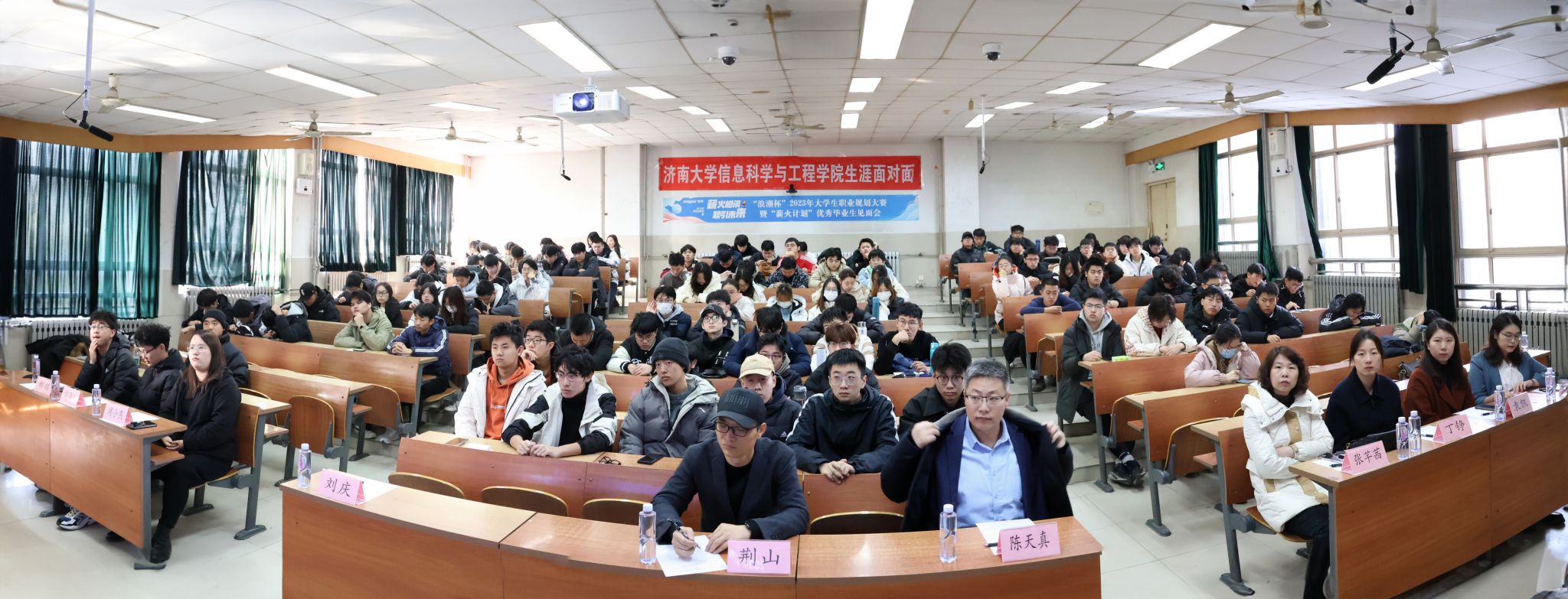 为贯彻落实党中央、国务院关于高校毕业生就业工作的决策部署,落实《国务院关于印发“十四五”就业促进规划的通知》精神,加强高校生涯教育和就业指导,搭建在校学生与优秀毕业生的沟通交流平台,进一步增强学生对就业流程的理解,以科学的方法规划个人职业生涯,11月25日上午,PG娱乐官网 在11教1101举办了“生涯面对面”优秀毕业生见面会暨“浪潮杯”2023年大学生职业规划大赛启动仪式,PG娱乐官网 副院长荆山、浪潮优派副总经理陈天真出席活动。PG娱乐官网 辅导员、班主任代表及浪潮校企合作专业近200名学子参加活动。