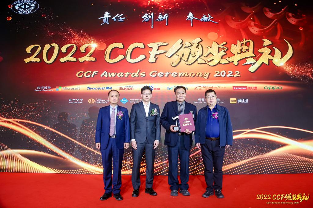杨波教授荣获“CCF杰出教育奖”。CCF理事长梅宏院士、奖励委员会主席廖湘科院士、字节跳动高校合作负责人方奕庚博士共同为杨波教授颁奖。