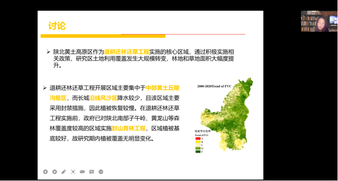 叶璇同学从研究背景、研究区概况及数据、研究方法及内容、结果与讨论和展望五个方面进行讲述,明确黄土高原植被动态,揭示陕北黄土高原植被变化特征;识别陕北黄土高原生态系统服务变化,为黄土高原生态修复-退耕还林还草工程提供科学支撑。