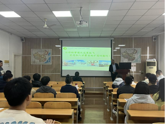 伯声报告厅开展了招聘宣讲会。高建海科长首先播放了第四地质矿产勘查院的宣传片,向学生们全面展示单位的发展历史、业务范围、人员概况、地质方面的资质和部分项目成果等。并对本次招聘岗位、人员数量、福利待遇等进行了详细介绍,期待大家的加盟。