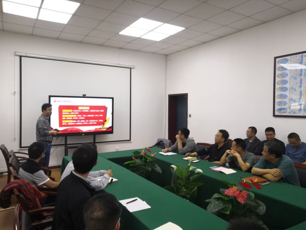 会议室为矿产石油党支部讲授主题教育专题党课。矿产石油党支部党员参加专题党课。专题党课由矿产石油党支部书记夏昭德主持。