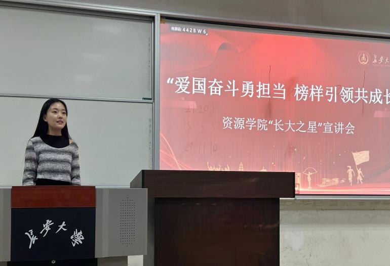 的发展脉络及地质专业特色,希望大家能以饱满的热情投入到地质学习中来;求真之星、领航之星李晨菲作为一名外语学子,从听说读写四个方面向大家分享了英语学习方法,希望同学们能够有所进益;长大之星(个人)、双创之星洪灏琪从日常规划、学习方法,科研竞赛和生活建议四个方面向大家分享自己的经验,建议大家多尝试接触科研工作,参加课外活动,丰富大学生活。