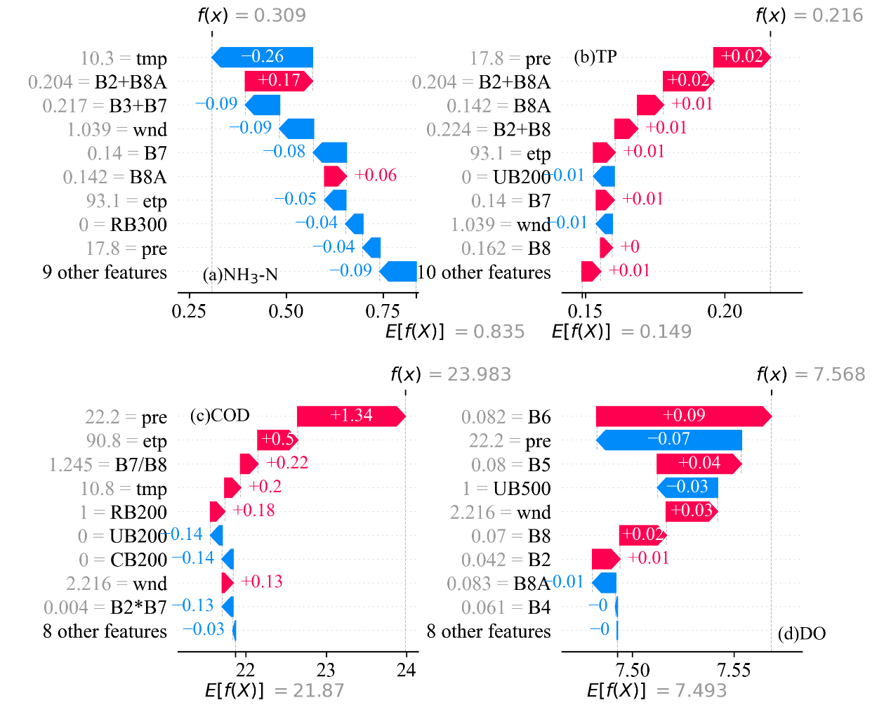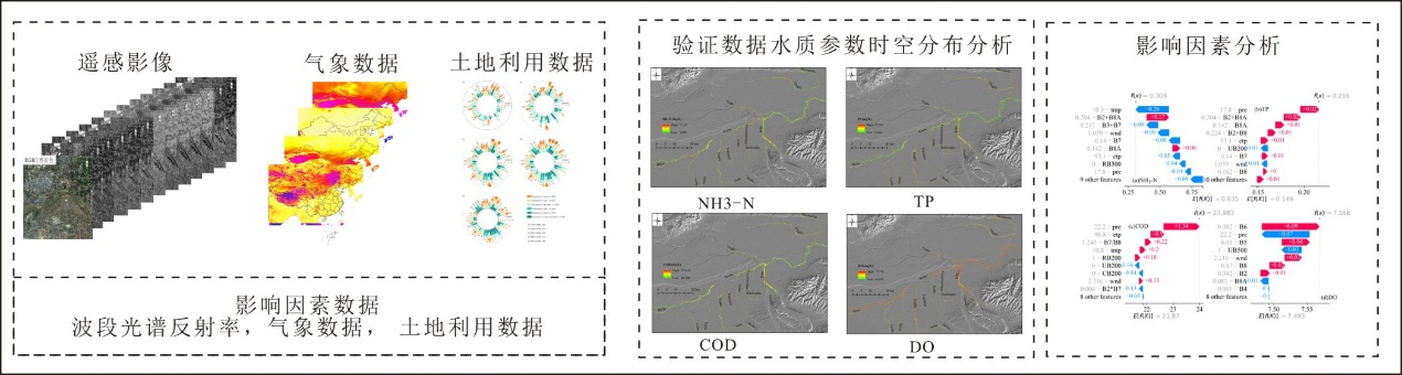 采用SHAPShapley Additive exPlanations)分析方法,本研究深入剖析了各水质参数影响因素的相对重要性(见图3)。影像光谱反射率对水质参数的影响最为显著,其次是气象数据(特别是降水、温度),而土地利用数据的影响相对较小。这一发现为后续多源数据融合的水质监测研究奠定了坚实的理论与实践基础。本研究成果不仅验证了多源数据与机器学习算法在城市河流水污染物量化中的可行性,更为广域河流水质时空动态监测提供了关键技术支持。