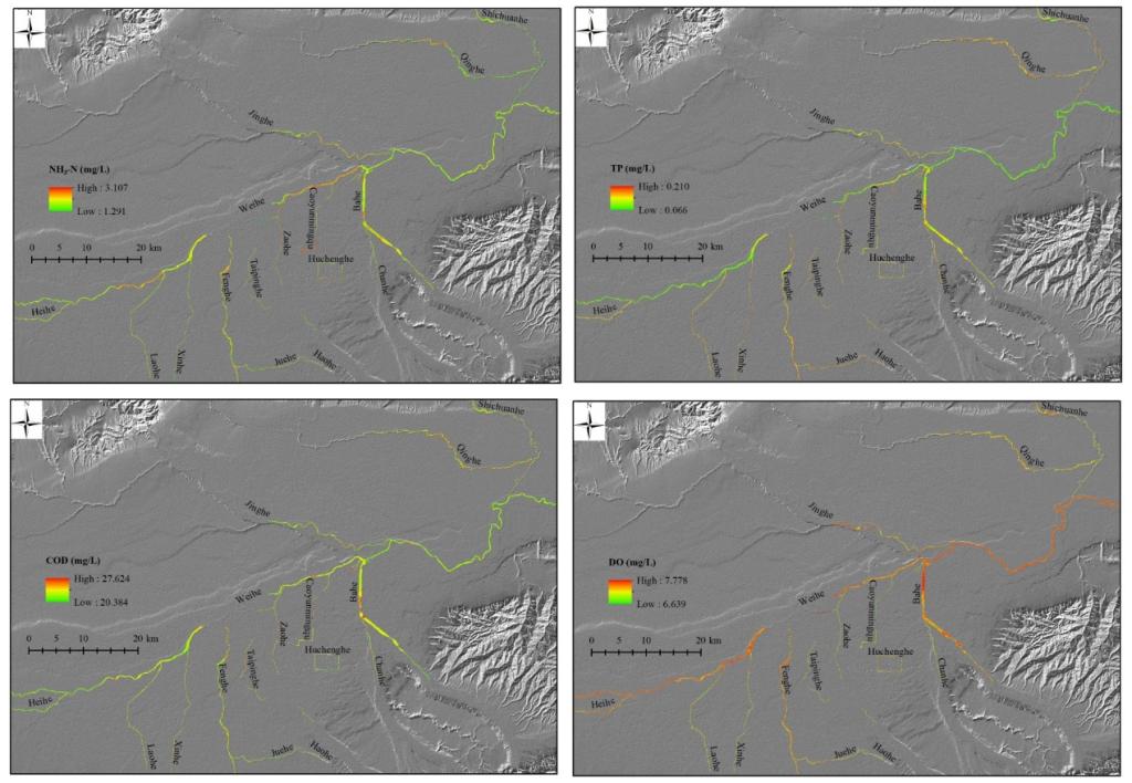 模型精度评估采用四参数体系,2展示了最优模型在测试与验证数据集上的拟合散点图。随着多源数据的整合,NH3-NTPDOCOD预测模型展现出稳定性,分别在300米、200米、500米及200米的缓冲区范围内达到最高精度。基于最优模型得到四种水质参数的空间分布图(图4),展示了氨氮、总磷、化学需氧量和溶解氧的高低值分布,再结合国家地表水质量监测标准,进行单一和综合的水质状况分析。