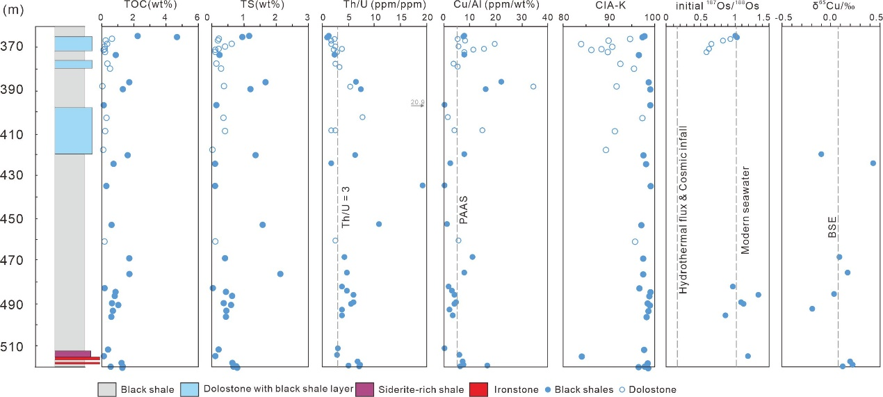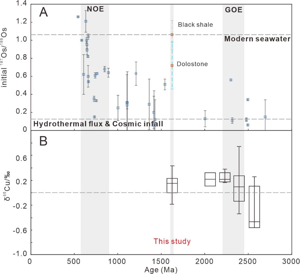 -锇(187Re-187Os体系不仅是一种用途广泛的精密计时器,还可以有效地示踪沉积古环境。在氧化的大气圈,ReReO4-形式被搬运进入海洋,187Re通过β-衰变逐渐转变为稳定同位素187Os,这一衰变过程具有稳定的半衰期(约41.6×1010年)。海水187Os/188Os组成反应了放射成因Os和非放射成因Os输入状态,例如现代海洋187Os/188Os比值约为1.06,这是由于陆表径流带来了大量氧化风化来源的放射成因Os。而来自宇宙尘埃和海底热液Os同位素具有非放射成因特征,187Os/188Os约为0.13。因此,海水187Os/188Os可以示踪地球表层氧化还原环境演化。近年来,铜同位素也用于研究地球表生环境演化过程,例如前人研究表明,氧化风化大陆硫化物(例如黄铜矿和辉铜矿)将会通过陆表径流向海洋输送重铜(65Cu)同位素。我国华北克拉通16.4亿年串岭沟组发育有地球平静期最古老、保存最好的黑色页岩。鉴于此,pg娱乐 杨秀清教授、中国地质科pg娱乐 矿产资源研究所毛景文院士及其国内外合作者对我国华北克拉通串岭沟组中黑色页岩和白云岩开展了元素、Re-OsCu同位素组成研究,取得了如下重要认识: