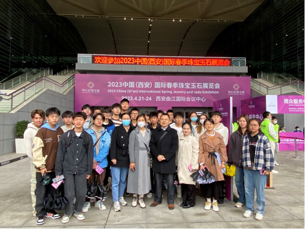 珠宝教研所组织2022级地质7班开展了一场别开生面的世界地球日主题班会活动。班级全体同学跟随着所长汪帮耀老师、班主任许丽丽老师和授课教师高莎莎老师的脚步,伴随着一缕缕透凉、清甜的春风,一起前往曲江国际会议中心。在那里,一场国际性的珠宝玉石展览盛会正在进行中!