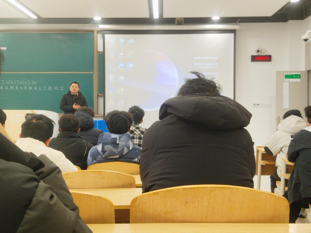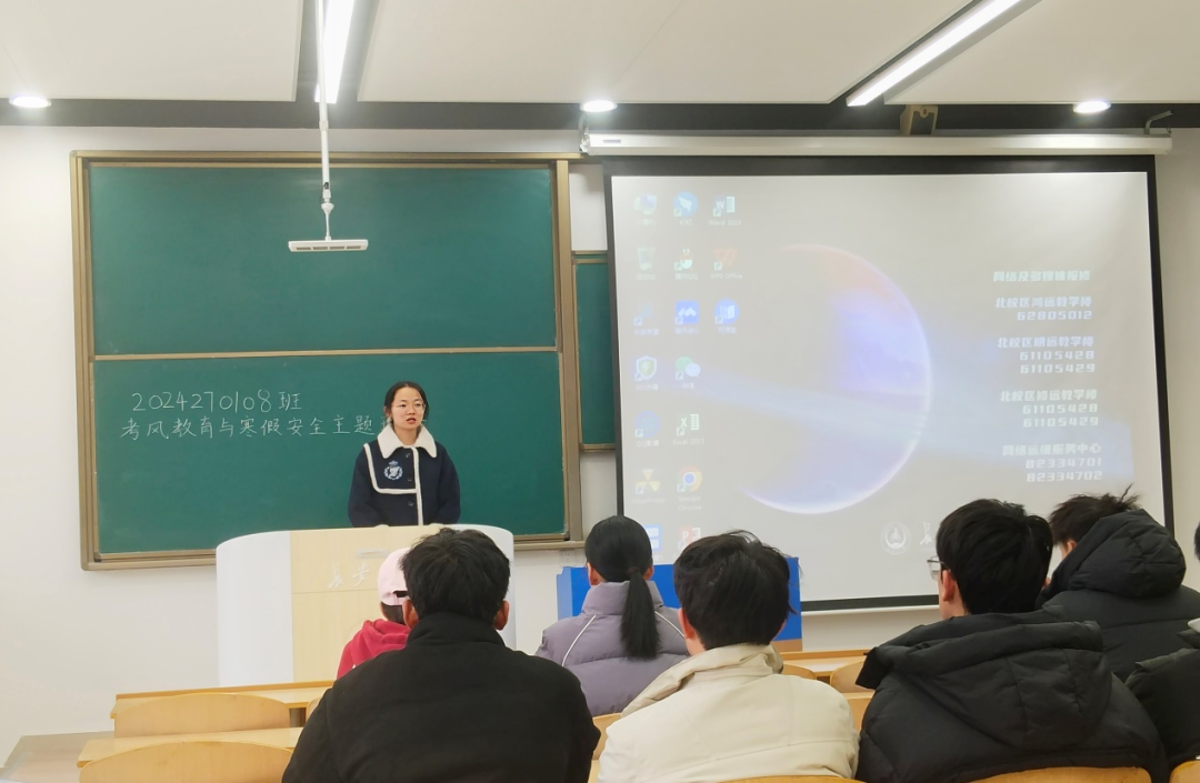 地质学类8班在WH1205开展了“考风考纪与寒假安全教育”主题班会。班会由班主任汪帮耀主持,8班全体学生参加。