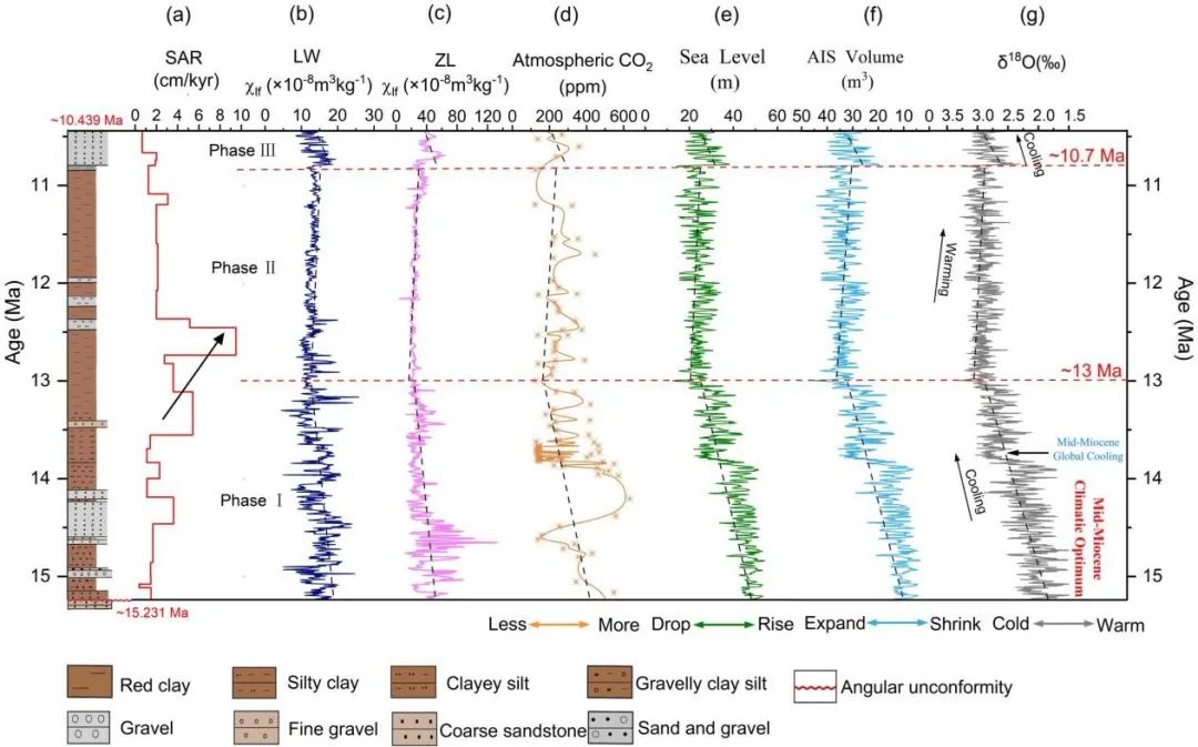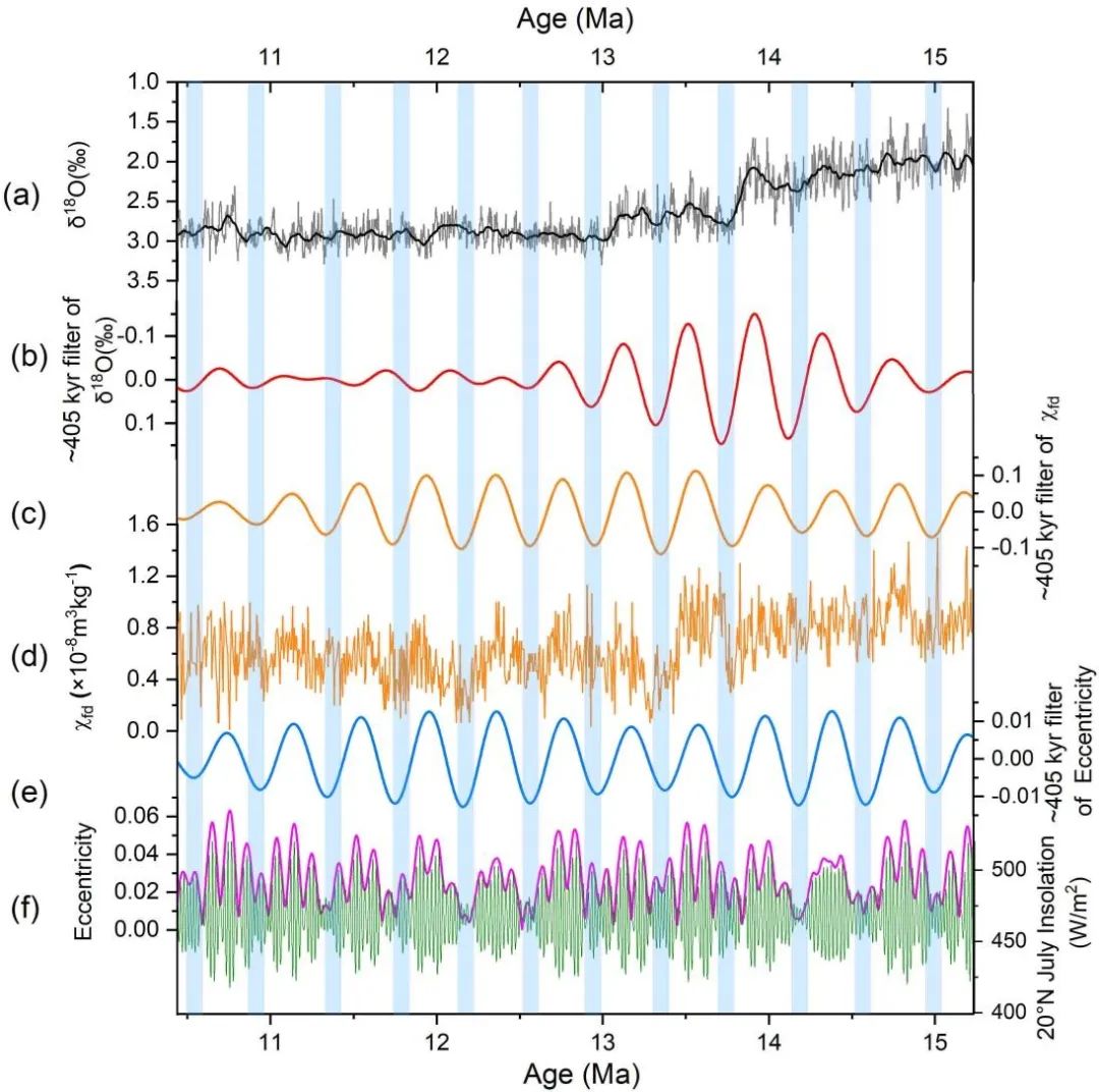 地球环境研究所强小科研究员和宋友桂研究员,湖北师范大学张蕊讲师,以尖扎盆地(15.231–10.439 Ma)发育的一套连续的风成红粘土沉积物(厚度为89.1 m)为研究对象,基于磁性地层学,锆石U-Ph定年和旋回地层学等方法,并整合青藏高原东北缘邻近盆地和全球气候变化的典型气候记录,揭示了中-中新世东亚夏季风在轨道和构造尺度上的变化及驱动机制。为阐明青藏高原抬升和东亚季风之间的联系,以及在全球气候变化下驱动东亚季风演变提供了重要的参考意义。研究结果表明,(1)尖扎盆地89.1 m厚的浪哇剖面开展磁性地层学和旋回地层学研究,建立了15.231至10.439 Ma的高精度天文年代标尺(2)东亚夏季风在15.231–10.439 Ma期间的演化划分为三个阶段:15.231–13 Ma间快速减弱期、13.0–10.7Ma间相对稳定但略有增强期、以及10.7–10.439 Ma间显著减弱期;(3)碎屑锆石U–Pb物源示踪与基于磁性地层学的沉积速率分析揭示了14.08-10.2 Ma间研究区物源变化,这归因于西秦岭山脉在13-12 Ma期间的快速隆升及其对青藏高原隆升的远程响应;(4)LW剖面的沉积速率分析证实,在盆地边缘斜坡带(临界坡度2°–3°范围内),风成沉积速率显著超过河流沉积速率,这种"弱河相-强风相"模式受双重机制驱动:坡度限制河流沉积作用,基岩-风积耦合增强沉积物捕获;(5)在轨道时间尺度上,频率磁化率记录显示出显著的长偏心率周期(~405 kyr),表明偏心率调控的低纬度夏季太阳辐射与南极冰盖波动共同主导了高原东北缘的长期降水变率。