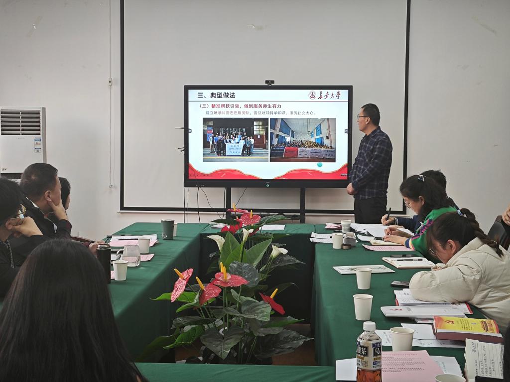 最后,党委书记黄喜峰作总结讲话,他指出,基层党建述职评议考核是深入贯彻习近平新时代中国特色社会主义思想、履行管党治党政治责任的一项重要举措,要持续深入学习贯彻党的二十届三中全会精神、全国教育大会精神,推进全面从严治党向基层延伸,推动基层党组织全面进步全面过硬。他在肯定各党支部2024年党建工作成绩的同时,对2025年党支部抓基层党建工作提出了三点要求:一是各党支部要把党建与业务紧密结合,抓党建、促发展;二是结合支部特色,充分发挥党支部的战斗堡垒作用和党员的先锋模范作用;三是以“双创”为抓手,打造地学特色党建品牌,以习近平新时代中国特色社会主义思想为指导,用高质量党建推动pg娱乐