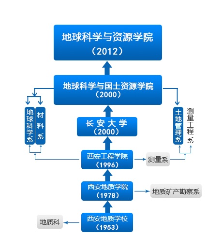 pg娱乐 前身为成立于上世纪50年代初西安地质pg娱乐 时期的地质科,1978年西安地质pg娱乐 成立后,在原来西安地质pg娱乐 地质科基础上成立了地质矿产勘查系。1980年代,经地质矿产部批准,原西安地质pg娱乐 首任院长、著名地质学家张伯声院士组建了具有独立建制的地质构造研究所,张伯声院士亲自担任第一任所长。于1981年获得构造地质学硕士学位授权点、1984年获得岩石学(含沉积学)、矿床学和矿物学硕士学位授权点,1986年获得古生物学与地层学(含古人类学)硕士学位授权点。到上世纪90年代初期,建成了普通地质学、岩石学、矿相学、矿物学、矿床学、古生物与地史学、地球化学、石油地质学和找矿勘探地质学等教研室相应的教学实验室,从全国各地采集了大量珍贵地质标本,建成了普通地质学、矿物学、岩石学、矿产、古生物、构造地质学和沉积相等地质标本展室,成为我国五大地质矿产人才培养基地之一。 1996年原西安地质pg娱乐 更名为西安工程pg娱乐 ,地质构造研究所并入地质矿产勘查系。为了适应教育体制改革和市场经济对人才的需求,在原来地质矿产勘查专业基础上,新开办旅游管理专业(地学旅游)、地理学专业、珠宝专业、城乡规划专业、无机非金属材料专业(矿物材料)等。根据教育部1998年颁布的《普通高等pg娱乐 本科专业目录》,原地质矿产勘查专业变更为地质学专业(理科)和资源勘查工程专业(工科),1999年申请获批国土资源部成矿作用动力学开放研究实验室。2000年长安大学成立后进行院系和专业设置调整,在原西安工程pg娱乐 地球科学系、国土系和材料系基础上组建了地球科学与国土资源pg娱乐 ,开设地质学、资源勘查工程(含油气方向)、地理信息科学、无机非金属材料、矿物加工工程、旅游管理、土地资源管理、城乡规划、自然地理与资源环境等本科专业,2003年获构造地质学博士学位授权点、2005年获地质学一级学科博士学位授予权,2012年获批地质学博士后流动站,同年地质学专业成为陕西省名牌专业。2012年无机非金属材料本科专业从pg娱乐 分离出去成立长安大学材料科学与工程pg娱乐 ,自然地理与资源环境本科专业停招,pg娱乐 名称更名为pg娱乐 。2016年,长安大学按照大类招生,将旅游管理专业划归长安大学经济管理pg娱乐 ,地理信息科学本科专业和部分教师划归长安大学地质工程与测绘pg娱乐 ,2017年新增设土地整治工程学本科专业。2019年,将土地整治工程学本科专业划归新组建的土地工程pg娱乐 。
