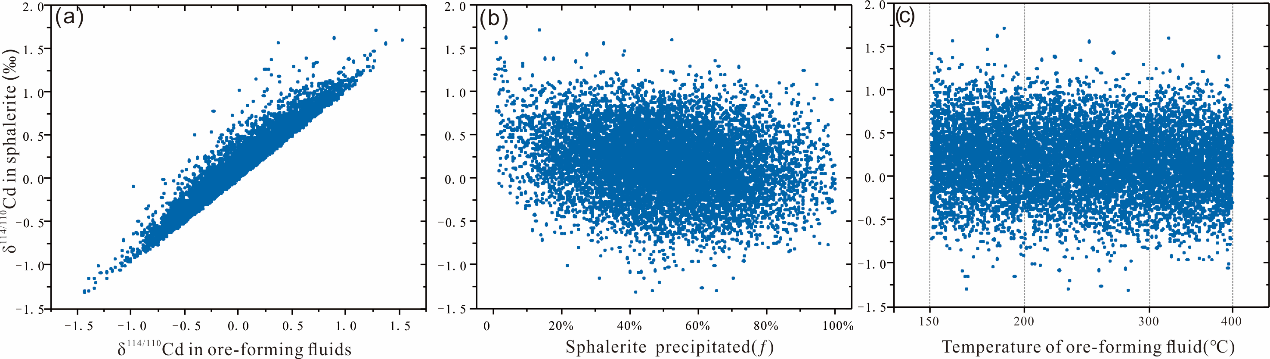 图1.蒙脱卡诺随机抽样结果:(a)闪锌矿与流体镉同位素组成的相关性;(b)闪锌矿镉同位素组成与闪锌矿沉淀比例相关性;(c)闪锌矿镉同位素组成与流体温度相关性