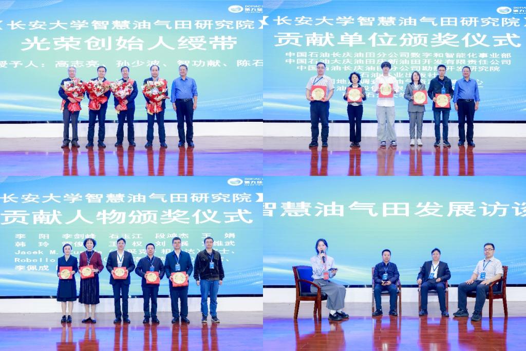 会议同期举行了长安大学智慧油气田研究院成立20周年庆典。庆典环节由副院长李佐臣教授主持,通过创始人绶带、贡献单位与人物颁奖、高端访谈等环节,回顾研究院从2005年数字油田研究所起步,到如今成为领域内重要研究机构的奋斗历程。研究院院长付国民教授为高志亮、陈石、孙少波、智功献等四位创始人献花绶带,并向中国石油长庆油田分公司数字和智能化事业部等7家贡献单位、李阳院士等14位贡献人物颁奖,以此感谢各界同仁长期以来的支持与陪伴。