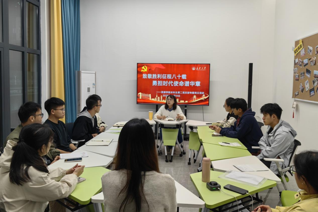 本科生第二党支部于鸿渐园团体活动室开展“致敬胜利征程八十载,勇担时代使命谱华章”专题党日活动。党支部书记黎皛带领支部全体党员、预备党员共同参与,在回望历史中坚定理想信念,在交流感悟中明确使命担当。